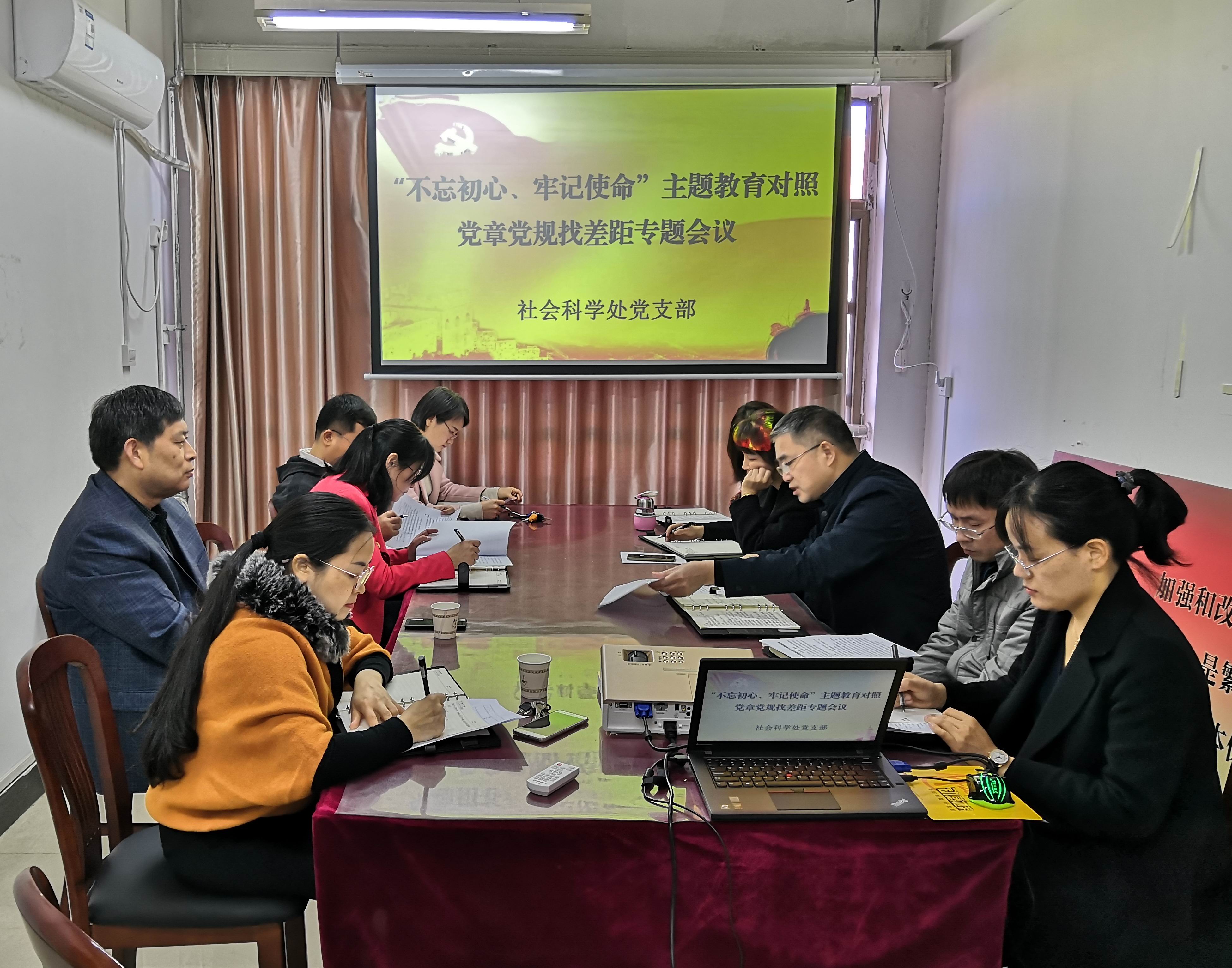 为贯彻落实习近平总书记重要指示精神,组织引导党员领导干部以彻底的自我革命精神对照党章党规找差距,11月11日上午,社科处党支部在力行楼414会议室召开“不忘初心、牢记使命”主题教育对照党章党规找差距专题会议,校巡回指导四组组长王全才,成员谢玉芬和社科处党支部全体党员参会,会议由社科处处长、党支部书记牛海鹏主持。