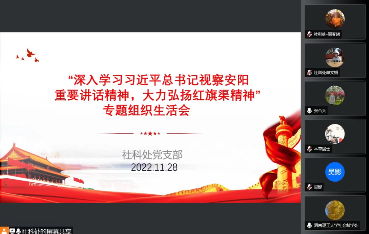 为深入学习贯彻党的二十大精神和习近平总书记视察河南安阳重要讲话精神,根据学校党委安排,11月28日下午,社科处党支部通过线上会议形式,召开“深入学习习近平总书记视察安阳重要讲话精神,大力弘扬红旗渠精神”专题组织生活会,会议由党支部书记张合兵主持,副校长朱建光参会。