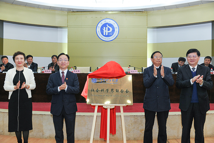 高治军、李庚香、苗树群和邹友峰为“河南理工大学社会科学界联合会”揭牌