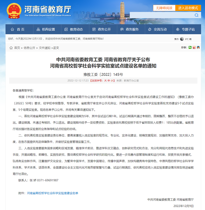 据悉,河南省高校哲学社会科学实验室建设共立项建设10个实验室,建设周期为5年,其中含试运行期1年,建设期满,未通过考核的,予以退出。实验室以服务国家战略和区域发展为导向,推进学科交叉融合,充分利用现代信息技术和先进实验手段,开展战略性、前瞻性、实践性研究,推动高校哲学社会科学研究的现代化。