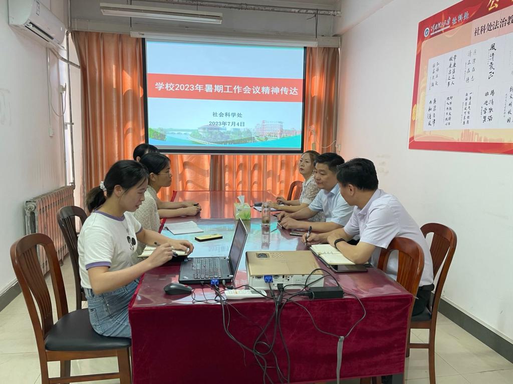 7月4日下午,社科处在力行楼414会议室,召开会议传达学习学校2023年暑期工作会议精神,处长张合兵主持。