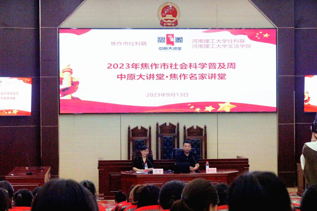 9月13日下午,社科普及周中原大讲堂焦作名家讲堂系列讲座在北校区模拟法庭举行。此次讲座由焦作社科联、河南理工大学社科联和文法学院主办。焦作市诗词学会秘书长、焦作市作协副主席李乐观老师应邀做了题为“云台山下的魏晋风度”的精彩讲座,讲座由文法学院副院长曹爽主持。