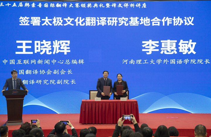 11月25日,中国翻译研究院——河南理工大学“太极文化翻译研究基地”授牌签约仪式在北京中国外文局报告厅举行。中国外文局副局长、全国翻译专业学位研究生教育指导委员会主任委员于涛、中宣部国际传播局研究处处长季萌,中国互联网新闻中心总编辑、中国翻译协会副会长、中国翻译研究院副院长王晓辉,我校副校长赵同谦,上海大学党委副书记欧阳华、福建农林大学副校长林庆藩等参加仪式。仪式由当代中国与世界研究院副院长范大祺主持。