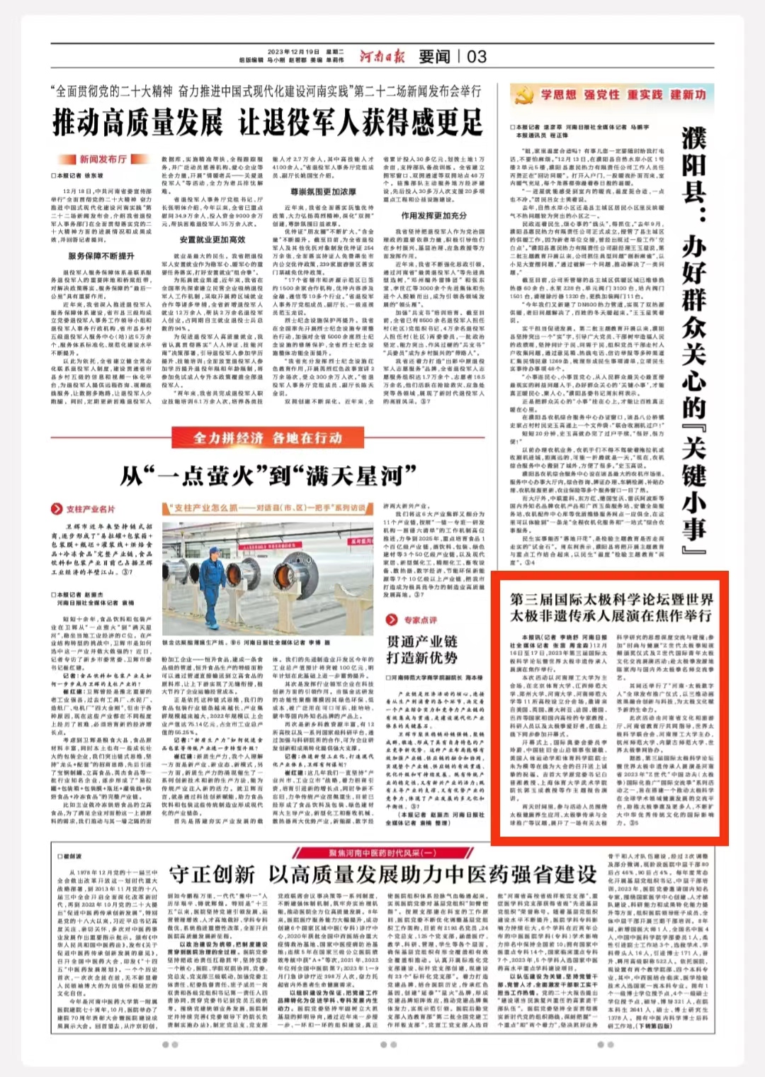 近日,《河南日报》第3版,以《第三届国际太极科学论坛暨世界太极非遗传承人展演在焦作举行》为题,报道2023年第三届国际太极科学论坛暨世界太极非遗传承人展演在河南理工大学举行。具体内容如下: