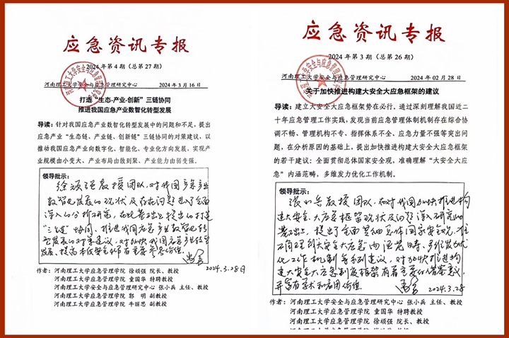 近日,应急管理学院教授徐顽强、张小兵领衔完成的研究报告《打造“生态-产业-创新”三链协同 推进我国应急产业数智化转型发展》《关于加快推进构建大安全大应急框架的建议》,通过智库渠道提交全国政协教科卫体委员会,得到了全国政协领导高度重视。全国政协常委、教科卫体委员会副主任兼教育组组长、应急管理部原副部长(正部长级)尚勇连续给予肯定性批示。