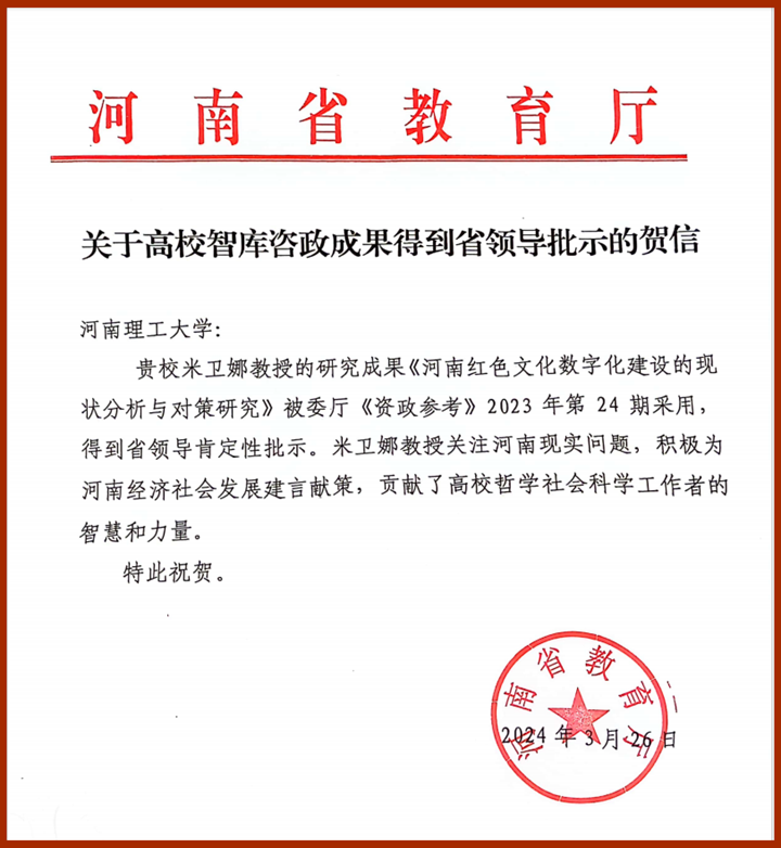 近日,马克思主义学院副教授米卫娜、申海涛的研究成果《河南红色文化数字化建设的现状分析与对策研究》(刊发在《资政参考》2023年第24期),获得河南省人民政府副省长张敏的肯定性批示,被批转至省政府相关部门认真阅研,并收到省教育厅的贺信。