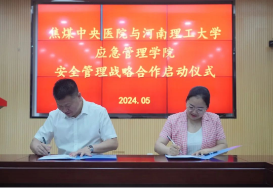 启动仪式上,马好斌与谢玉芬现场签订了《焦煤中央医院与河南理工大学应急管理学院校院安全管理战略合作协议》。