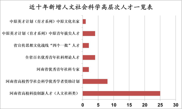 以重大项目为纽带,加强优势资源整合,坚持“人才-团队-平台”建设三位一体,设立杰出青年、高层次人才、创新团队等培育专项项目,分类分梯次筛选重点人才和团队培育对象,形成“层次清晰、梯次成长、特长发展”的校-省两级人才团队培育建设体系。累计培育各类人才50余人,获中原文化名家1人、中原青年拔尖人才6人,省“四个一批”人才、省高校科技创新人才、省高校哲社优秀学者等省部级人才42人,焦作市青年社科专家等地厅级人才称号39人;培育校级创新团队10个,获批省高校哲学社会科学创新团队10个,位居全省高校前列。