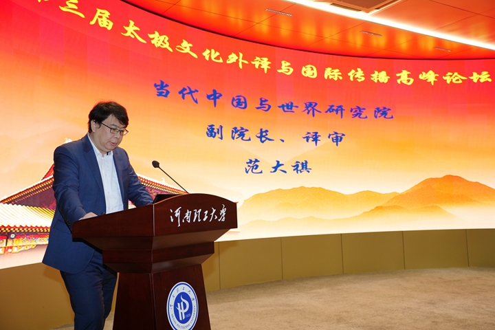 本网讯(通讯员 许亚男)10月19日,由中国外文局中国翻译研究院、中共河南省委外事工作委员会、河南省高等教育学会外语教学研究分会和学校主办的“第三届太极文化外译与国际传播高峰论坛”在力行楼学术报告厅顺利举行。当代中国与世界研究院副院长范大祺、省委外办二级巡视员焦开举、副校长边亚东,以及校职能部门和部分兄弟学院领导、教师、学生参加会议。论坛由外语学院院长李惠敏主持。