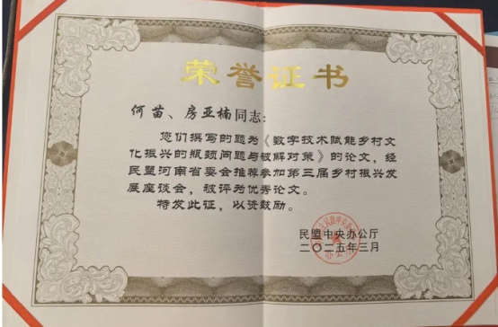 3月23日至24日,第三届乡村振兴发展座谈会在湖北宜昌举办。财经学院数字经济系主任、民盟河南理工大学委员会副主委何苗教授撰写提交的《数字技术赋能乡村文化振兴的瓶颈问题与破解对策》被评为优秀论文,并作为10名优秀论文作者代表之一在大会上作交流发言。