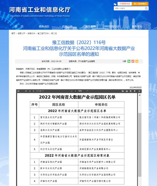 河南省工业和信息化厅相关负责人介绍,目前河南已经确定“智慧岛大数据产业园”“郑州天健湖智联网产业园”“洛阳大数据产业园”“许昌高新区智能电力装备制造大数据产业园”“鹤壁市大数据产业园”等5个园区为2022年河南省大数据产业示范园区;确定“河南省区块链产业园”“新乡市大数据产业园”“焦作腾云数字经济产业园”“河南科慧产业园”等4个园区为2022年河南省大数据产业示范园区培育对象。