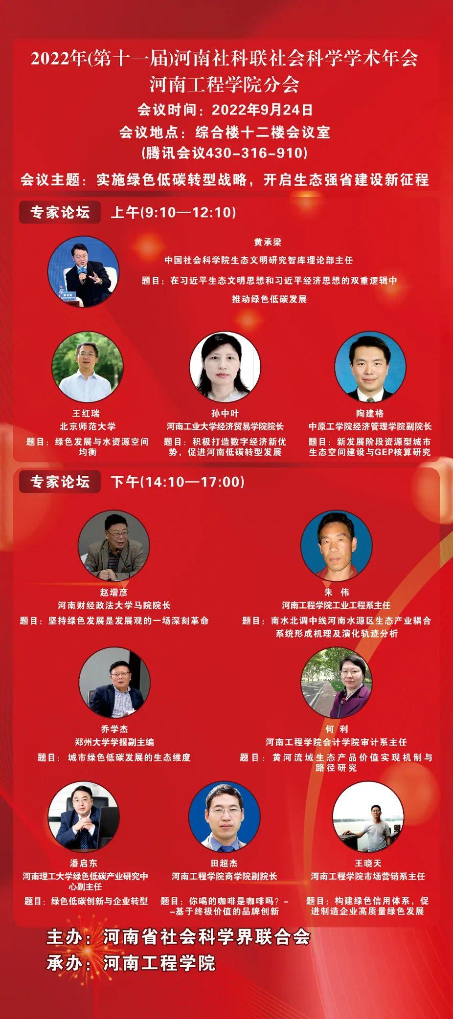 9月24日,我校财经学院潘启东老师受邀参加2022年(第十一届)河南社会科学学术年会分会场(四)——“实施绿色低碳转型战略,开启生态强省建设新征程”理论研讨会,会议由河南工程学院承办。
