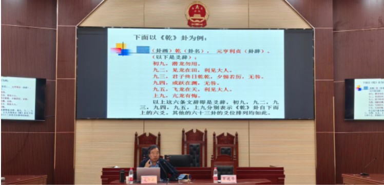 党怀兴以焦作的太极拳文化为切入点分享了中华传统文化经典《周易》的价值。他从《党的二十大报告》中关于中华优秀传统文化的相关论述展开,从政治高度阐明《周易》文化研究的价值,指出有了中华优秀传统文化的依托才有我们的文化自信,要在中华优秀传统文化中找到做人的根本,做到仁义礼智信。他强调,现代国学研究成果辈出,在哲学、文学、史学、文献学、辞典编纂等方面,出版了一批新注和研究著作,对《周易》的研究从未停止,大家要阅读经典,接受优秀传统文化语言的熏陶。在谈到《周易》的“占筮”时,党教授现场演示了周易中的占卜方法,生动地展示了《周易》“占筮”的以术证道,以道导术理论。