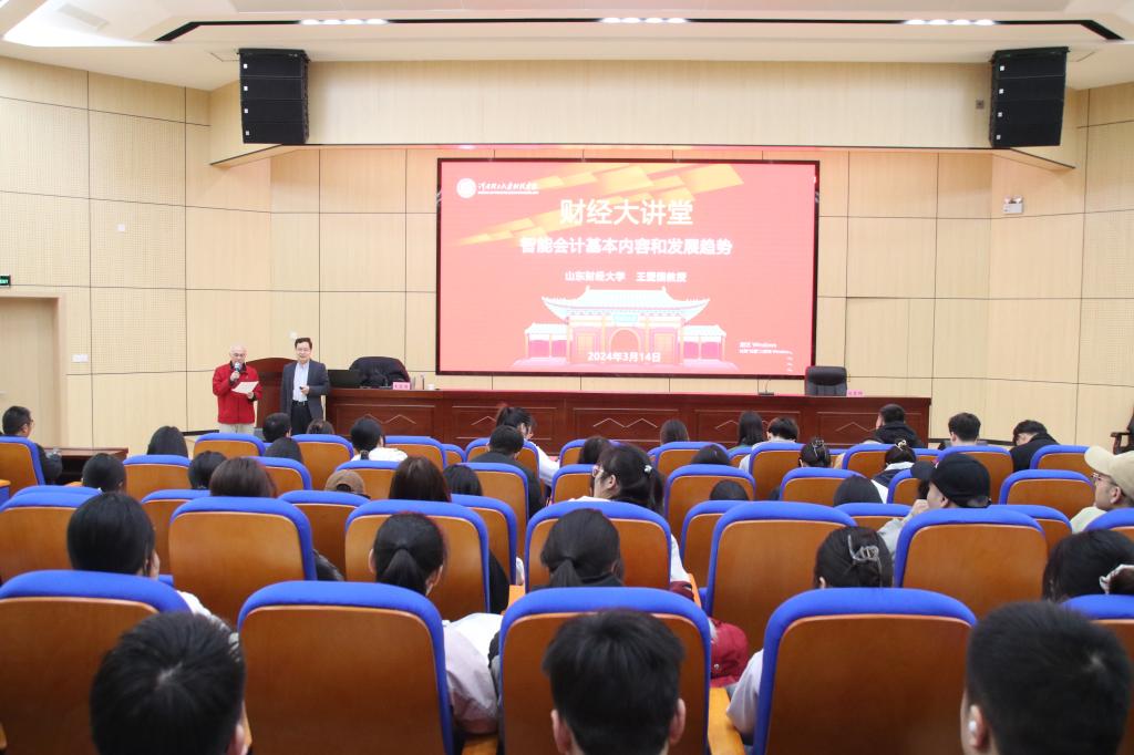 为全面提升师生对智能会计专业领域的认知和了解,3月14日上午,山东财经大学智能会计与数字企业研究院院长王爱国教授受邀做客“财经大讲堂”作《智能会计基本内容和发展趋势》专题报告,学院200余名师生参加报告会。报告会由院长刘霞辉主持。