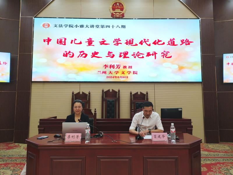 6月6日晚,文法学院“小雅大讲堂”第48期在北校区模拟法庭顺利举行,本次活动特邀兰州大学文学院院长、博士生导师李利芳教授,作了题为“中国儿童文学现代化道路的历史与理论研究”的学术讲座。文法学院院长冒建华教授主持。