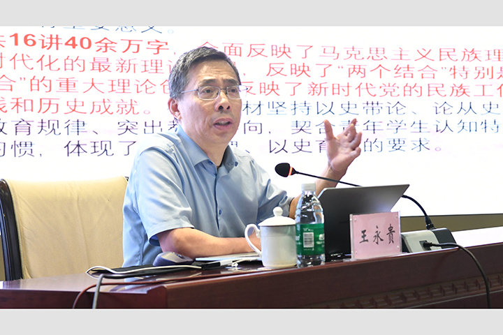 报告会上,王永贵以“推动中华民族共同体建设增强中华民族凝聚力”为主题,结合刚刚召开的全国民族团结进步表彰大会,围绕铸牢中华民族共同体意识展开系统论述:一是梳理中华民族共同体意识提出的时间脉络,指出了铸牢中华民族共同体意识对于推进民族工作、维护各民族根本利益、实现中华民族伟大复兴、巩固和发展社会主义民族关系的战略意义。二是厘清铸牢中华民族共同体意识的深刻内涵和核心要义,认为铸牢中华民族共同体意识要坚持“四个共同”的中华民族历史观,即各民族共同开拓辽阔疆域、共同书写悠久历史、共同创造灿烂文化、共同培育伟大精神;不断增进各民族“五个认同”,即对伟大祖国、中华民族、中华文化、中国共产党、中国特色社会主义的认同;牢固树立正确的“五观”,即国家观、历史观、民族观、文化观、宗教观;准确把握新时代民族工作的“四对关系”,即共同性和差异性的关系、中华民族共同体意识和各民族意识的关系、中华文化和各民族文化的关系、物质和精神的关系。三是指出了习近平总书记关于铸牢中华民族共同体意识的重要论述对于巩固和拓展中国特色民族问题的正确道路、推动党的民族工作取得新的历史性成就的重要意义。四是论析铸牢中华民族共同体意识的潜在挑战,并从推进体系建设、完善体制机制、共建精神家园等维度探讨了铸牢中华民族共同体意识的推进方略。这场高水平的学术盛会,不仅深化了师生对铸牢中华民族共同体意识的出场逻辑、价值逻辑、实践逻辑的理论认知,而且对与会师生拓展学术视野、强化学术思维、提升学术修养具有重要作用。会后,王永贵还对马克思主义理论学科建设进行了精心指导,并以座谈会的形式与师生进行了学术交流。