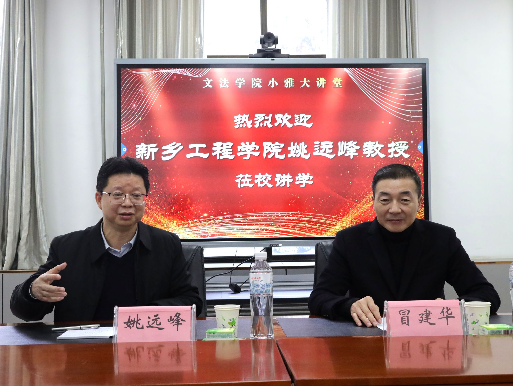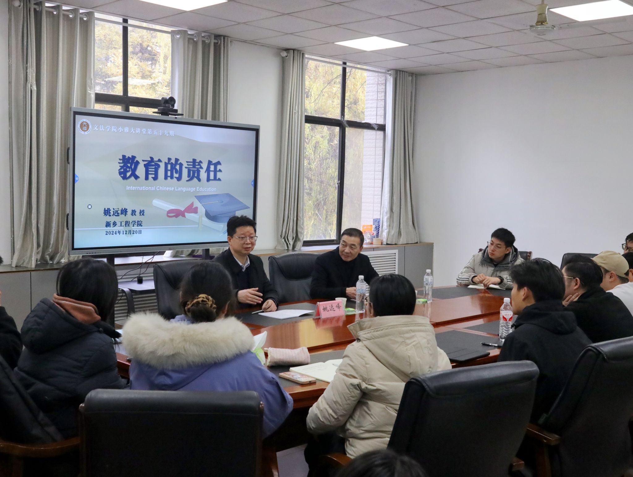 12月20日上午,文法学院第59期“小雅大讲堂”在学院218会议室成功举行。新乡工程学院姚远峰教授作主题为“教育的责任”的学术讲座。讲座由院长冒建华教授主持。
