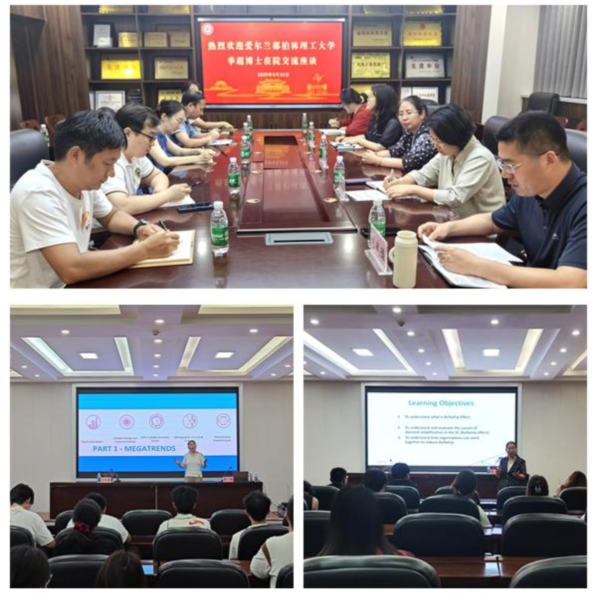 会后,在经管楼2201会议室召开座谈会,就智慧供应链国际交流合作方面进行交流,针对教师赴都柏林理工大学培训、访学及学生交流等常见的问题深入探讨。国际处处长李新娟介绍国家和学校公派留学的基本情况,表示将积极为师生创造国际交流机会,提升师生的国际化视野。该院院长傅端香对该院师生国际化现状进行了说明,并表示会大力支持青年教师访学和学生国际交流,开阔眼界、增长知识,以更好的面貌服务社会。此次学术报告和座谈,不仅让师生明晰供应链管理新技术、方法,对留学、访学有更细致认知,也利于师生明确目标、规划未来。未来,学校和该院将持续强化国际交流合作,为师生提供更多机遇,推动学科与人才培养发展。