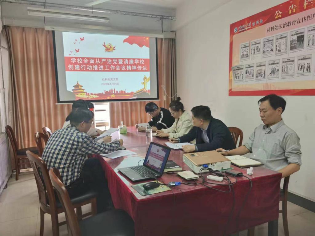 4月10日,社科处党支部在力行楼414会议室,召开会议传达学校全面从严治党暨清廉学校创建行动推进工作会议精神。处长张合兵主持。