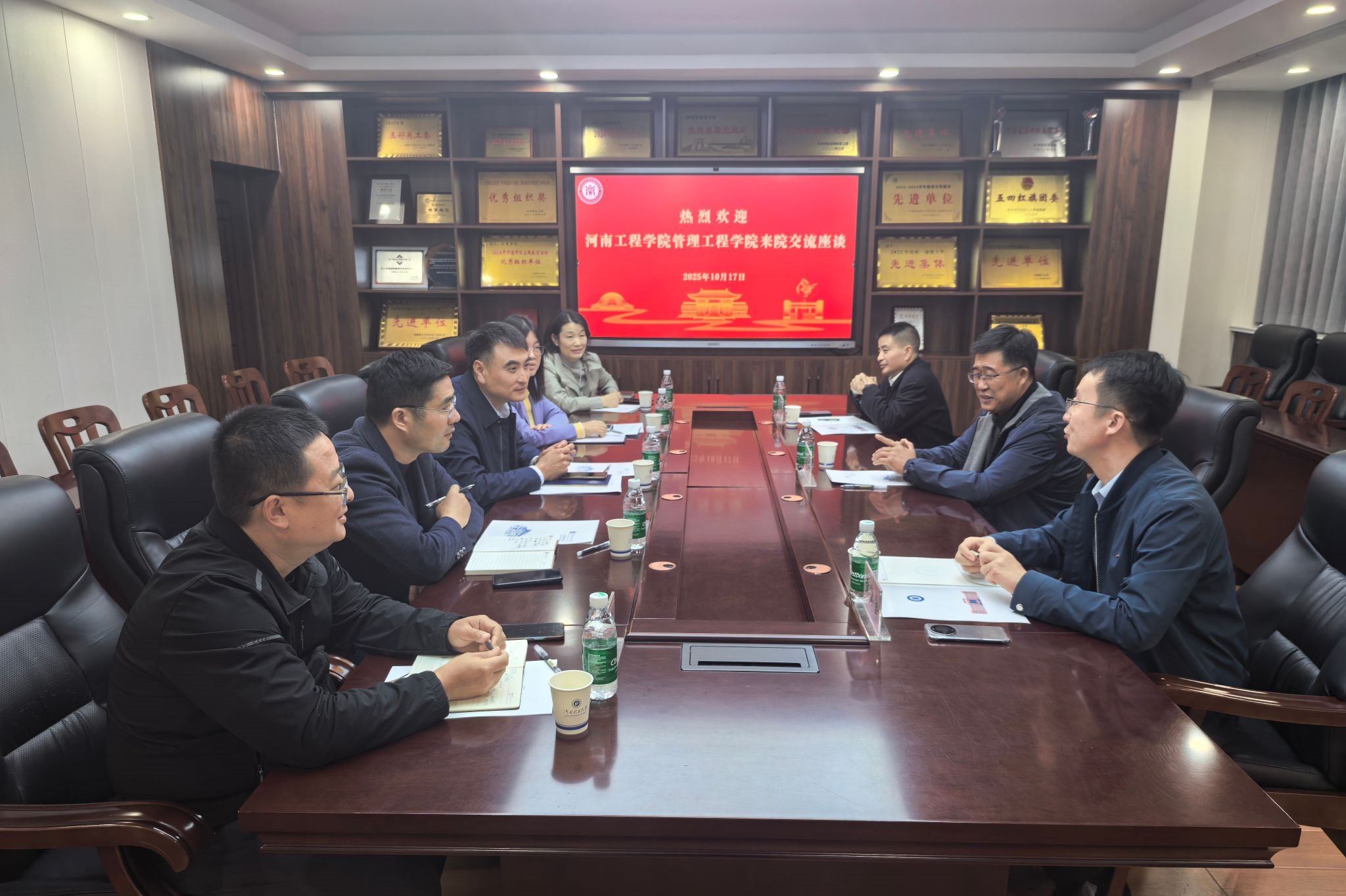 首先,郭学鹏代表学院对张立军一行的来访表示热烈欢迎。随后,院长傅端香详细介绍了工商学院在师资力量、专业建设、人才培养及教学科研等方面的基本情况;张立军阐述了河南工程学院管理工程学院的发展历程、学科建设、师资队伍建设等相关情况。最后,双方围绕专业设置、学位点建设、人才培养模式、科研项目申报等议题展开深入交流,分享各自的经验做法,并就未来合作方向达成初步共识。